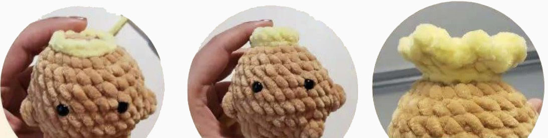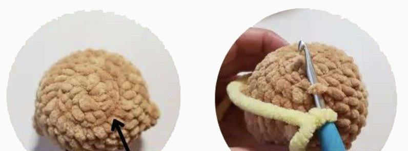 Utiliser le fil jaune. Revenir aux brins avant laissés visibles après le tour 3 et commencer ici à l’arrière de la tête.