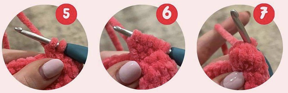 Faire un jeté à nouveau (3), tirer le fil à travers la maille, faire un jeté (4), puis passer à travers 2 boucles sur le crochet (5). Répéter encore 4 fois jusqu’à obtenir 6 boucles sur le crochet (6), puis faire un jeté et passer à travers les 6 boucles (7).