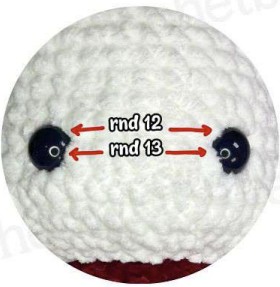 Ajouter deux yeux de sécurité de 14 mm entre les tours 12-13, avec environ 5 mailles visibles entre eux. Commencez à rembourrer la tête et continuez à rembourrer au fur et à mesure.