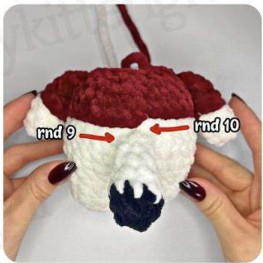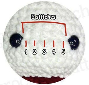 Étape 7 : Utiliser la Couleur D pour broder les joues sous les yeux entre les tours 14-15. Faire environ 2 couches de joues et les rendre d’environ 2 mailles de longueur.