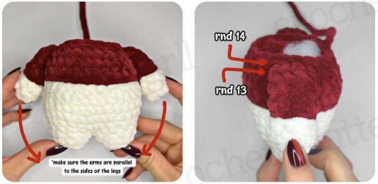 Étape 1 : Coudre les 2 bras sur les côtés du corps entre les tours 13-14. Veiller à ce qu’ils soient parallèles aux jambes.