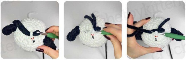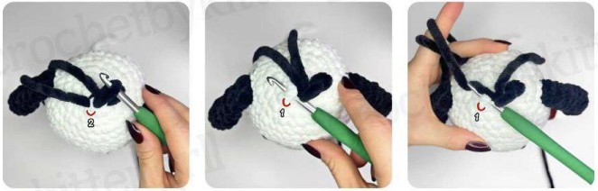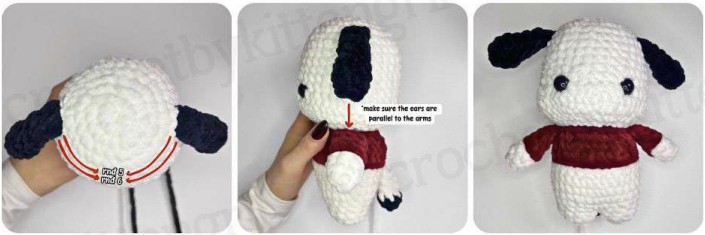 Étape 4 : Coudre les oreilles sur les côtés de la tête entre les tours 5-6, parallèles aux bras.