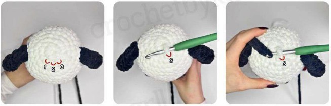1. Trouver les 3 mailles centrales à l’avant du tour 1 sur la tête. Nous les utiliserons pour créer les 3 touffes de cheveux.