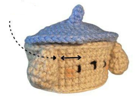 Les yeux sont espacés de 5 mailles l’un de l’autre (entre les tours 9 et 10)