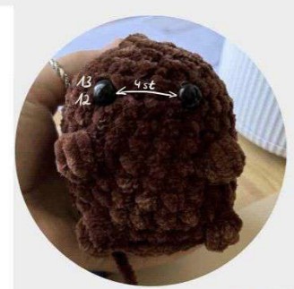 Placez les yeux de sécurité entre les tours 12 et 13, quatre mailles visibles d’écart, et rembourrez votre ours.