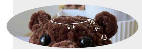 Arrêter le fil. Laisser un fil pour la couture. Coudre les oreilles entre les tours 13 et 15, à six mailles visibles d’écart (en comptant la distance sur le tour 15).