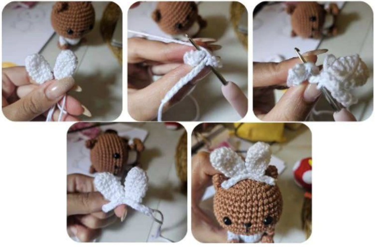 Maintenant, nous allons attacher les oreilles : plier l’oreille et prendre la chaînette du bandeau ainsi que les mailles des deux côtés de l’oreille, en fermant avec 3mc pour chaque oreille, puis 3mc dans les mailles en l’air du bandeau.