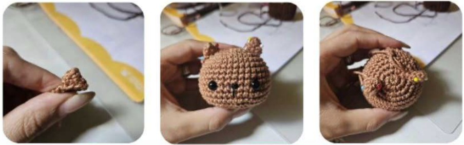 Positionner sur le haut de la tête, devant les oreilles de l’écureuil, jusqu’au tour 5 de la tête.