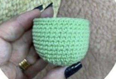 Avec la couleur verte, faites des ms dans FLO sur les boucles laissées entre les tours 15 et 16, Arrêter le fil en laissant du fil pour la finition avec une fausse ms.