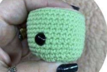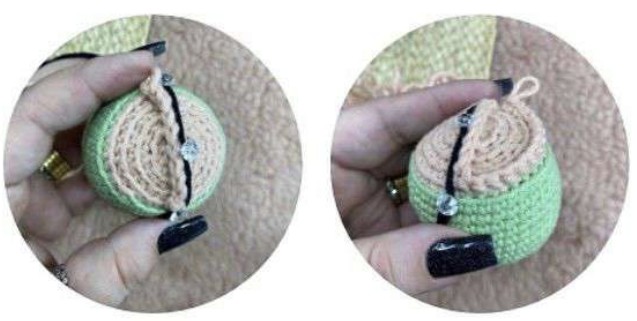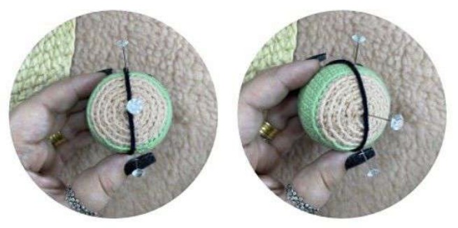 Placer l’œil entre les tours 10-11, coudre un bouton pour l’autre œil entre les tours 8-12