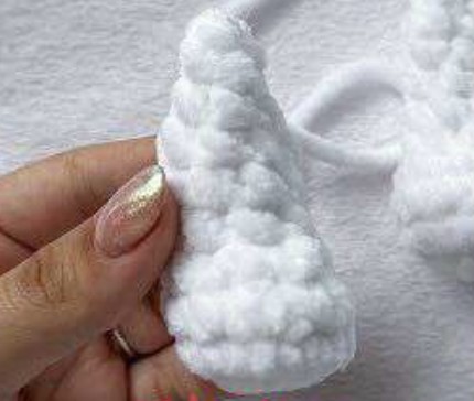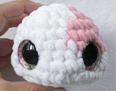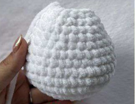 Pliez puis faites 6 ms sur le bord pour fermer. Arrêter le fil en laissant une longueur pour coudre sur les côtés de la tête entre les tours 3 et 7, à 3-4 mailles derrière les yeux.