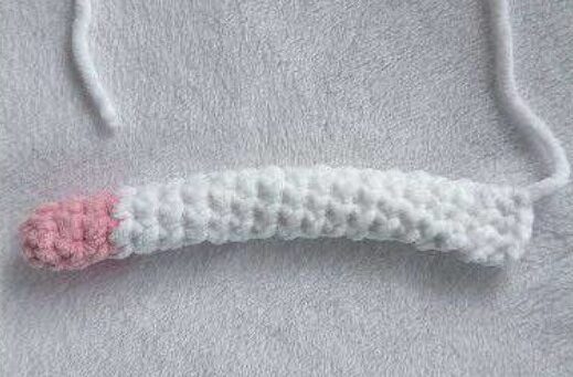 Arrêter le fil et laisser une longueur pour coudre à l’arrière du corps au niveau du tour 5. J’ai laissé ma queue sans rembourrage.