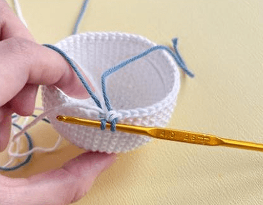 Rnd 16. Passez au fil rose ou bleu, (ms 7; augm au suivant) x 6 (54)