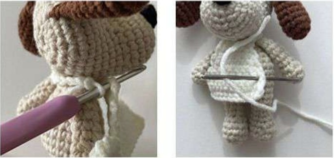 Ne pas rembourrer. Couper le fil et connecter au tour 11 sur le corps.