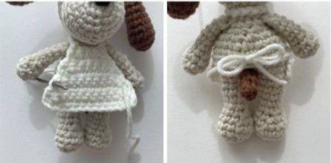 Couper un fil de 30 cm. Insérer une aiguille dans une extrémité entre les tours 3 et 4 du tablier, la faire ressortir de l’autre côté, et nouer un ruban à l’arrière pour terminer.
