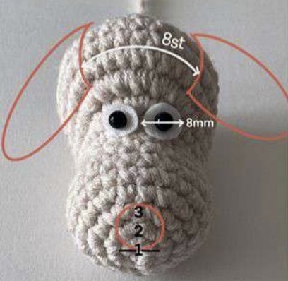 Coudre les oreilles entre les tours 13-16 (8 mailles d’écart)