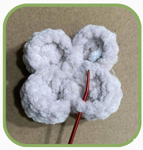 Avec de la feutrine marron foncé, découper 2 petites bandes. Elles doivent mesurer environ 1,5 à 2 mailles de long, et être aussi fines que possible. Les coller sur le tour 10, avec 4 mailles d’écart entre elles.