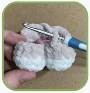 Retourner votre chaton à l’envers. Insérer le crochet entre les tours 8 et 9 du corps, faire 7 ml puis, en commençant dans la deuxième ml à partir du crochet, faire 6 ms.