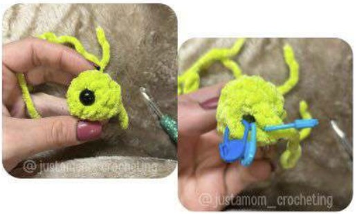Insérer les yeux entre les tours 3 et 4, avec environ 5 mailles visibles d’écart – les dim du tour 5 doivent être entre les yeux. Les 4 augm du tour 3 correspondent au sommet de la tête ! Remplir la tête.