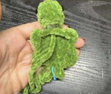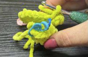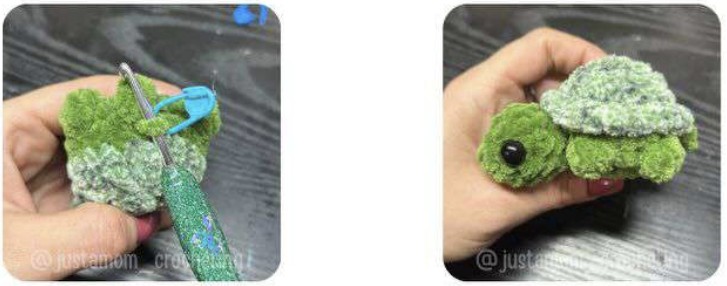 Arrêter le fil, laisser une queue assez longue pour refermer le corps. Finir de rembourrer et arrondir le haut de la carapace.