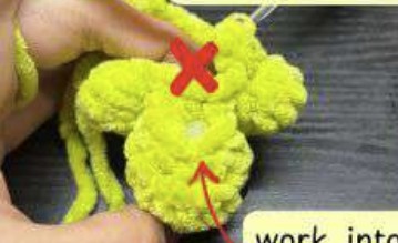 Travailler uniquement dans les 3 mailles du haut, ne pas traverser les mailles du corps.